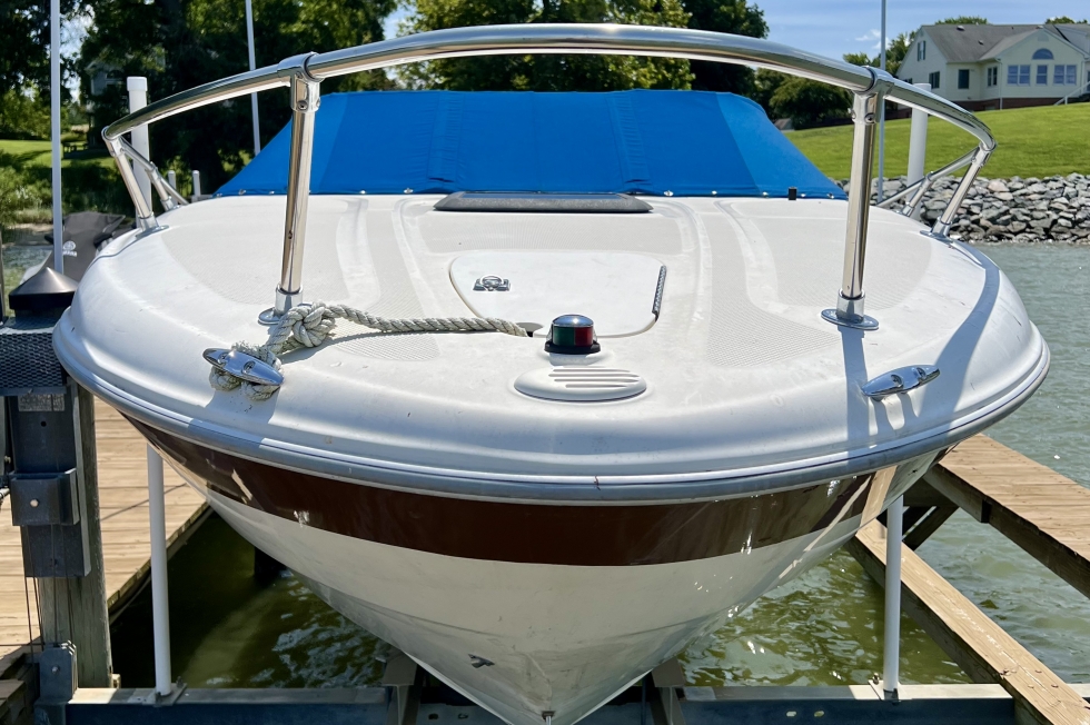 Includes bimini with canvas enclosure, digital depth finder, VHF radio, audio w/Bluetooth, cockpit cover, cockpit shower and snap in carpet.