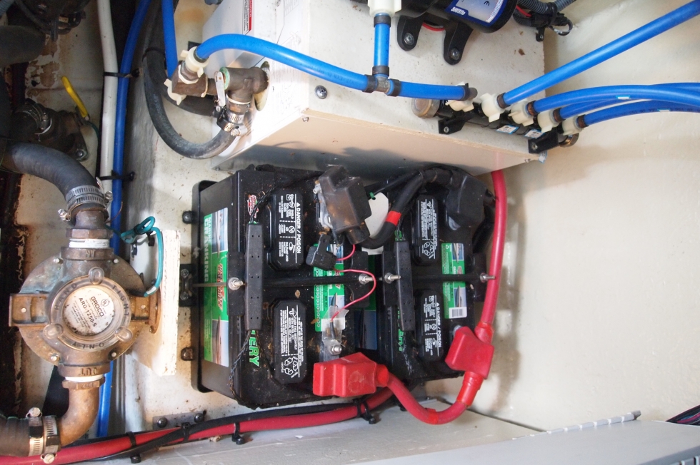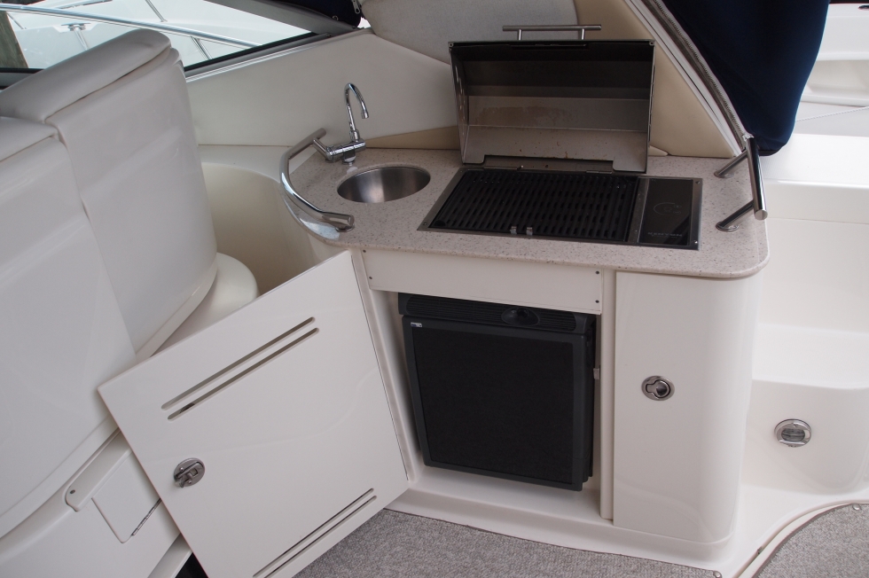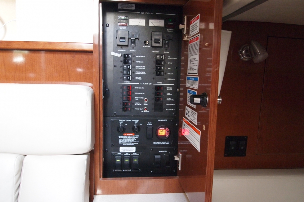 The engine room is accessible by electrically actuated ram lifting the cockpit seating area. Sea Ray is known for utilizing their partnership with Mercruiser which is quickly realized as all the engine room systems are thought out and easily accessible.