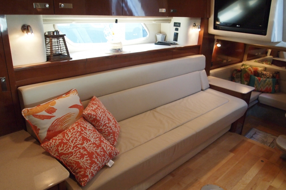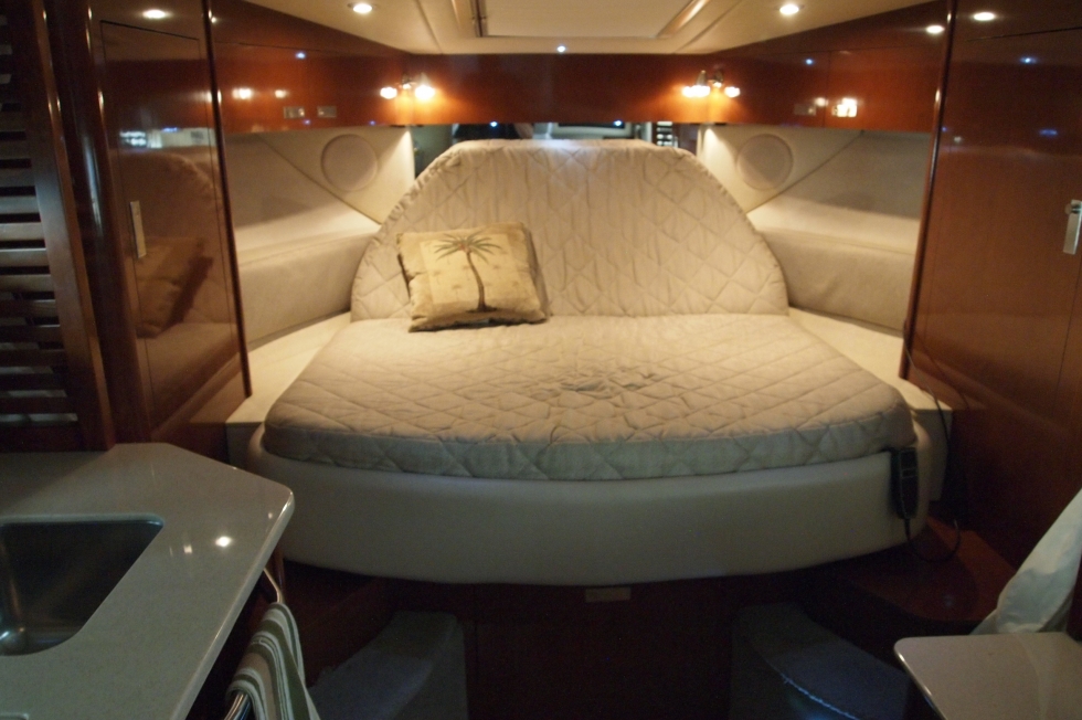 Transom swim platform is wide with flip down seating, speakers and remote. The cockpit seating is comfortable and we laid out with a beautiful teak table. Wet-bar includes fridge, built-in grill, and storage. The helm has double seats with flip up bolsters, great visibility, and all electronics, controls and systems within reach. Through the secure cabin door a few steps down to the beautiful and thoughtful layout of the cabin with hardwood flooring throughout. The galley counter top is expansive with windows on both sides providing plenty of natural light and great views. The lounge seat pulls out for additional sleeping area. The V-berth is an electrically actuated to be titled up as a lounge or flat for sleeping. Mid-cabin has good head room for extending the entertainment area or converting to full beam sleeping area with privacy curtain.