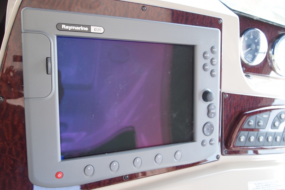 The long list of features and factory options includes the large hard-top with complete enclosure, TracVision Sat-TV w/custom dome mount, Kohler 5KW generator (260 hrs), Raymarine C120 radar/GPS/Chartplotter, SmartCraft VesselView, Raymarine VHF, windlass, spotlight, Premium sound system, through hull under water lights, cockpit SS grill & refrigerator, bow sunpad w/SS runners, mid-cabin TV w/Gaming port/DVD player, central vacuum, electrically actuated V-berth, transom shower, transom bench seat w/sound system remote, and more.