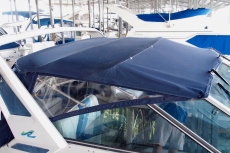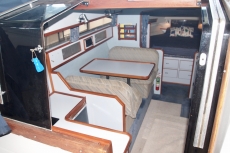 The 340 Express Cruiser is a big cruiser with 38’ LOA and 12’ beam provides a smooth comfortable ride. The one level cockpit with seating forward and aft lead to the large helm and double seat, and a few steps into the salon. Wide side decks for access forward and an open forward deck for handling lines or getting some sun. The open salon all the way to the forward stateroom. The well-equipped U-shaped galley is across from the large dinette.